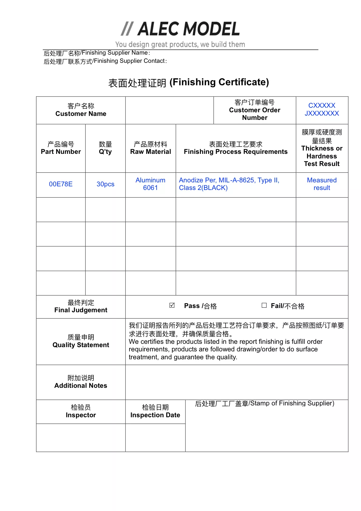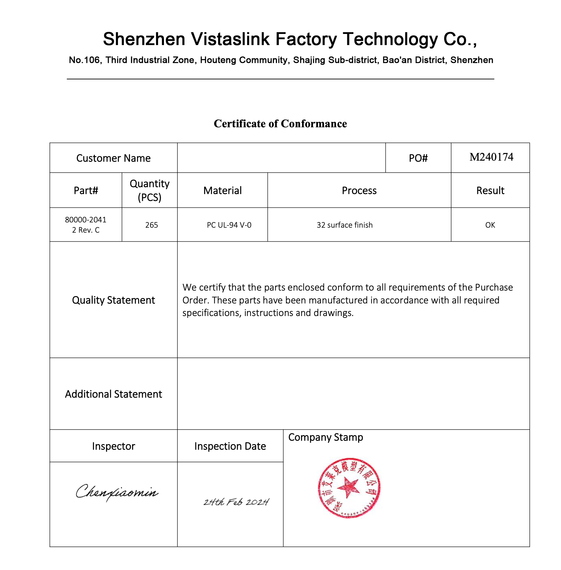 To demonstrate our commitment to precision and accuracy, we invite you to view our certificates of quality conformance and example quality control reports. Please click on the thumbnail images below to explore detailed documentation that reflects our stringent quality standards.